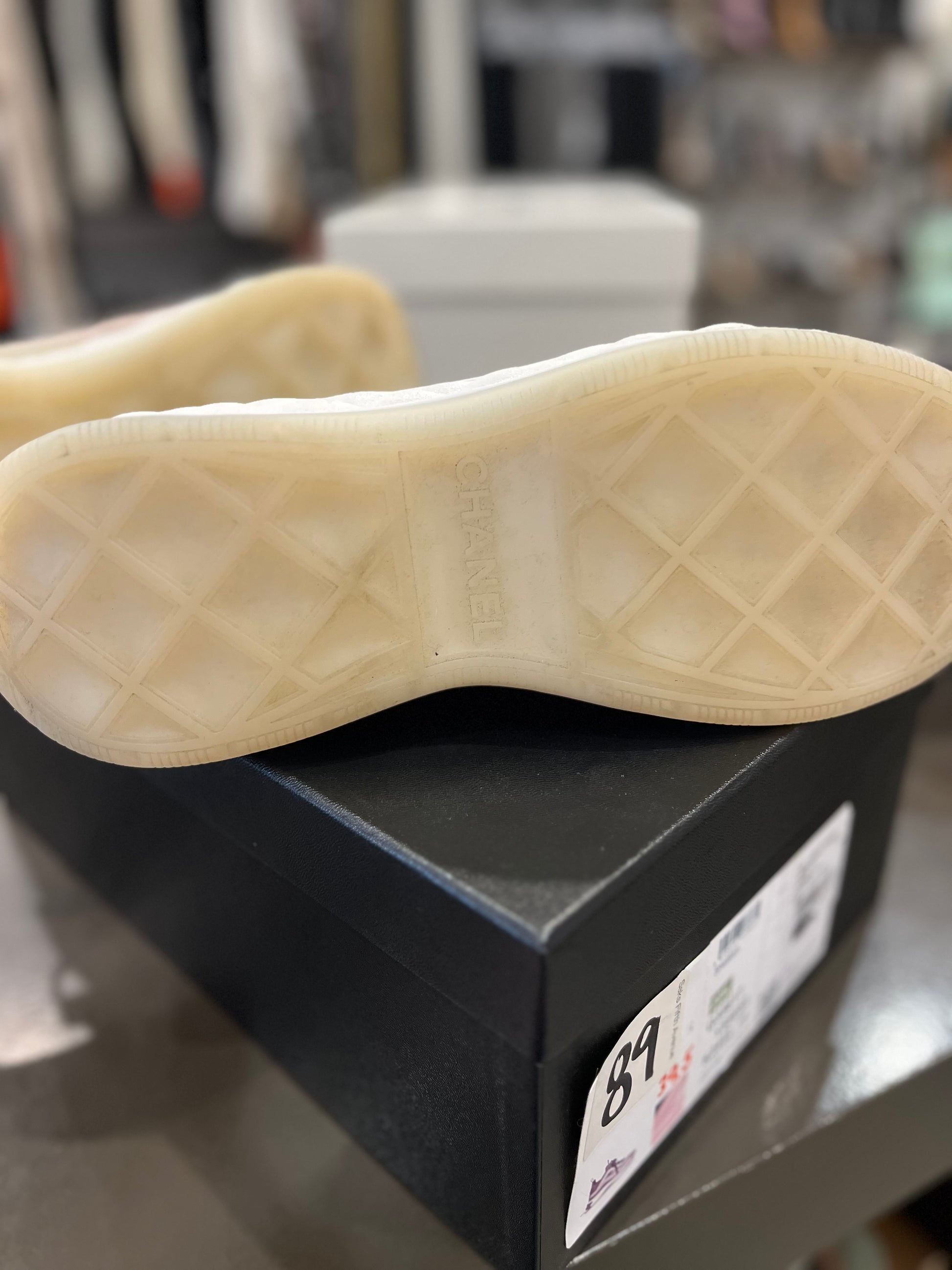 Featuring Chanel’s signature quilted rubber sole, an embossed CHANEL heel counter, and the iconic CC logo at the side, these sneakers blend comfort with high-fashion appeal.