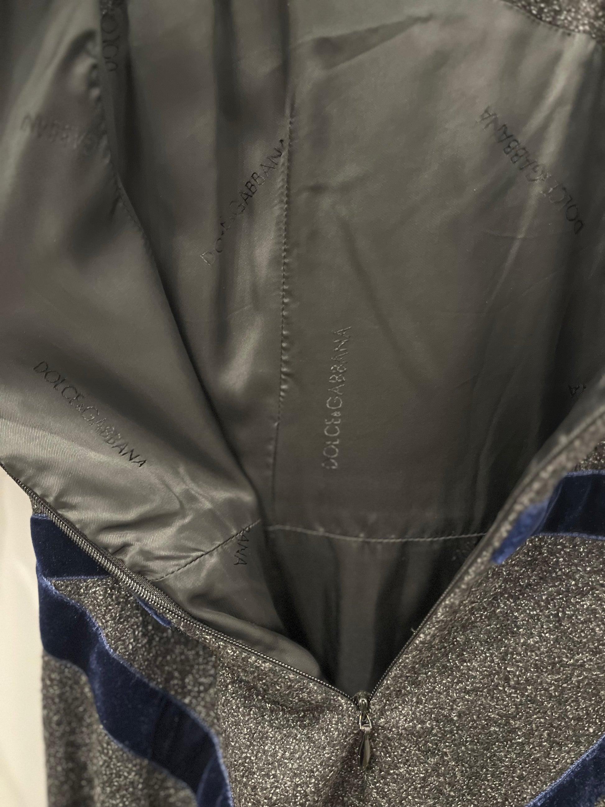 Elegant and impeccably tailored, this sleeveless sheath dress from Dolce & Gabbana showcases the brand’s signature Italian craftsmanship and body-conscious design. Crafted from a refined wool-blend fabric with a subtle textured finish, the dress is elevated by black velvet trim arranged in a striking crisscross motif that defines the waist and enhances the silhouette.