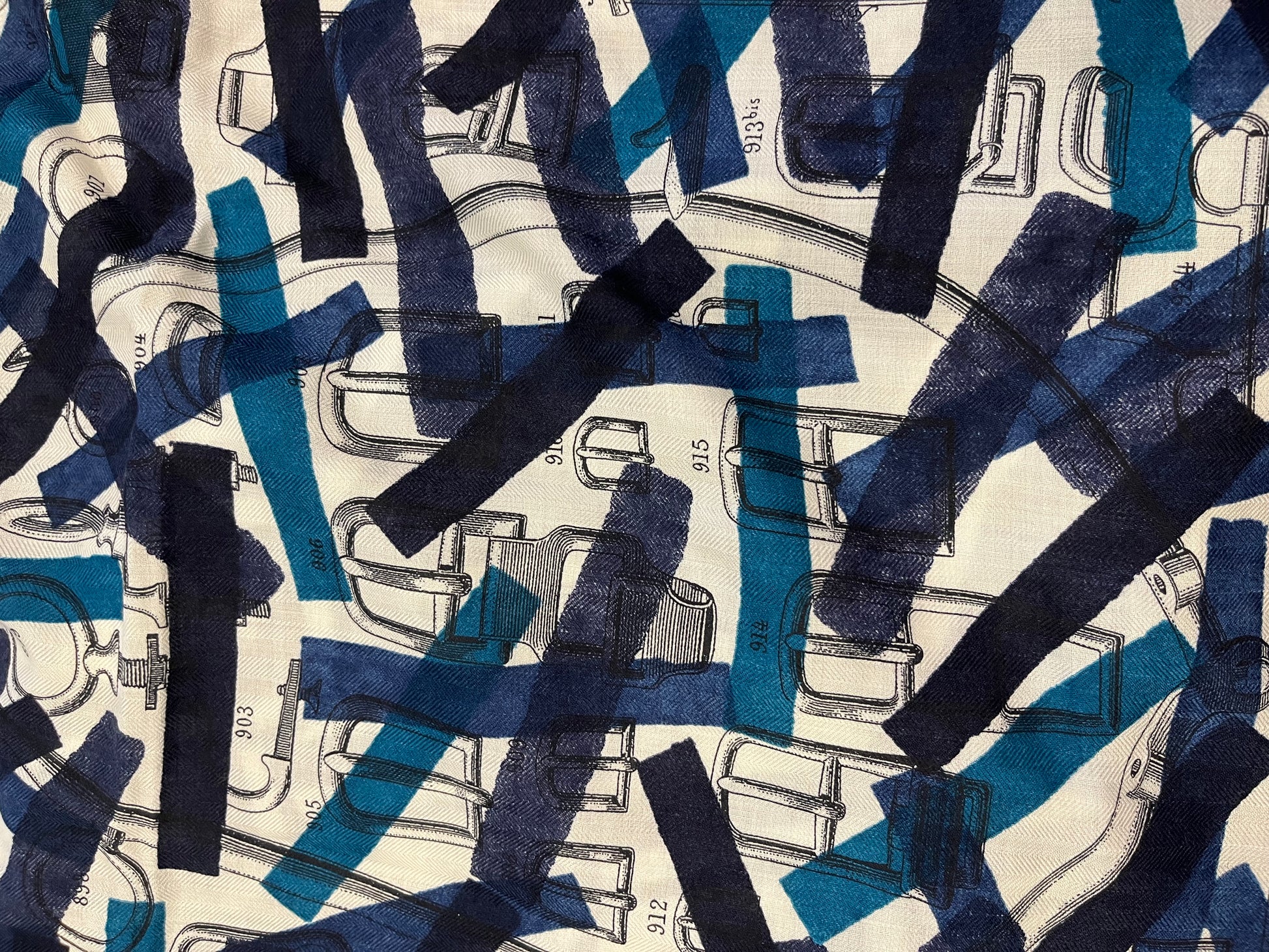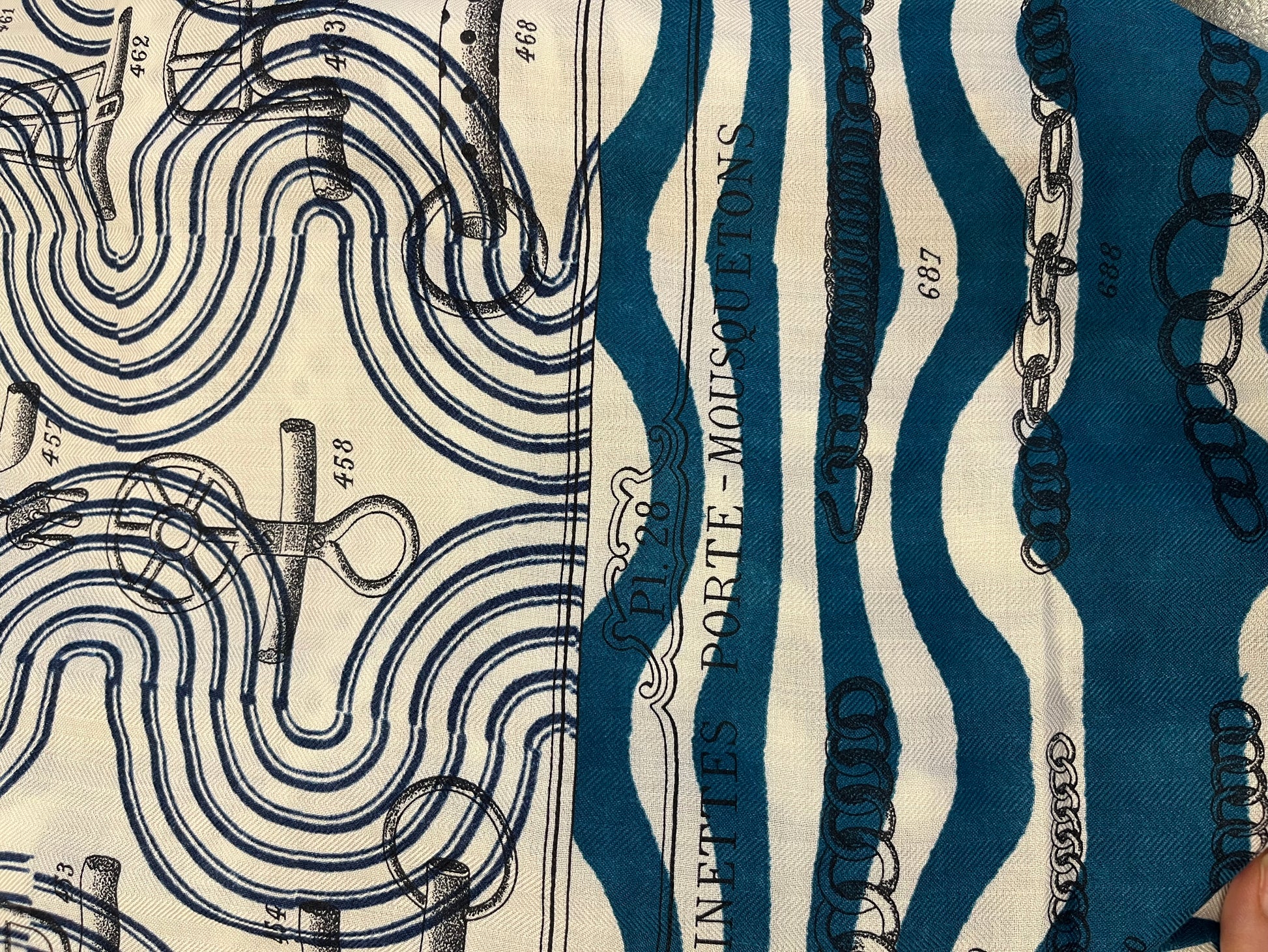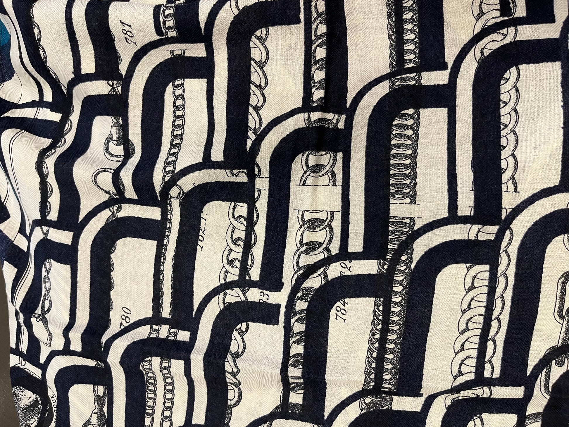This striking Hermès 140 cm cashmere and silk shawl features a bold geometric patchwork design that blends archival chain motifs, graphic patterns, and classic Hermès iconography. Rendered in sophisticated shades of navy, indigo, teal, ivory, and black, the oversized square offers endless styling possibilities—draped, wrapped, or worn as a statement layer.