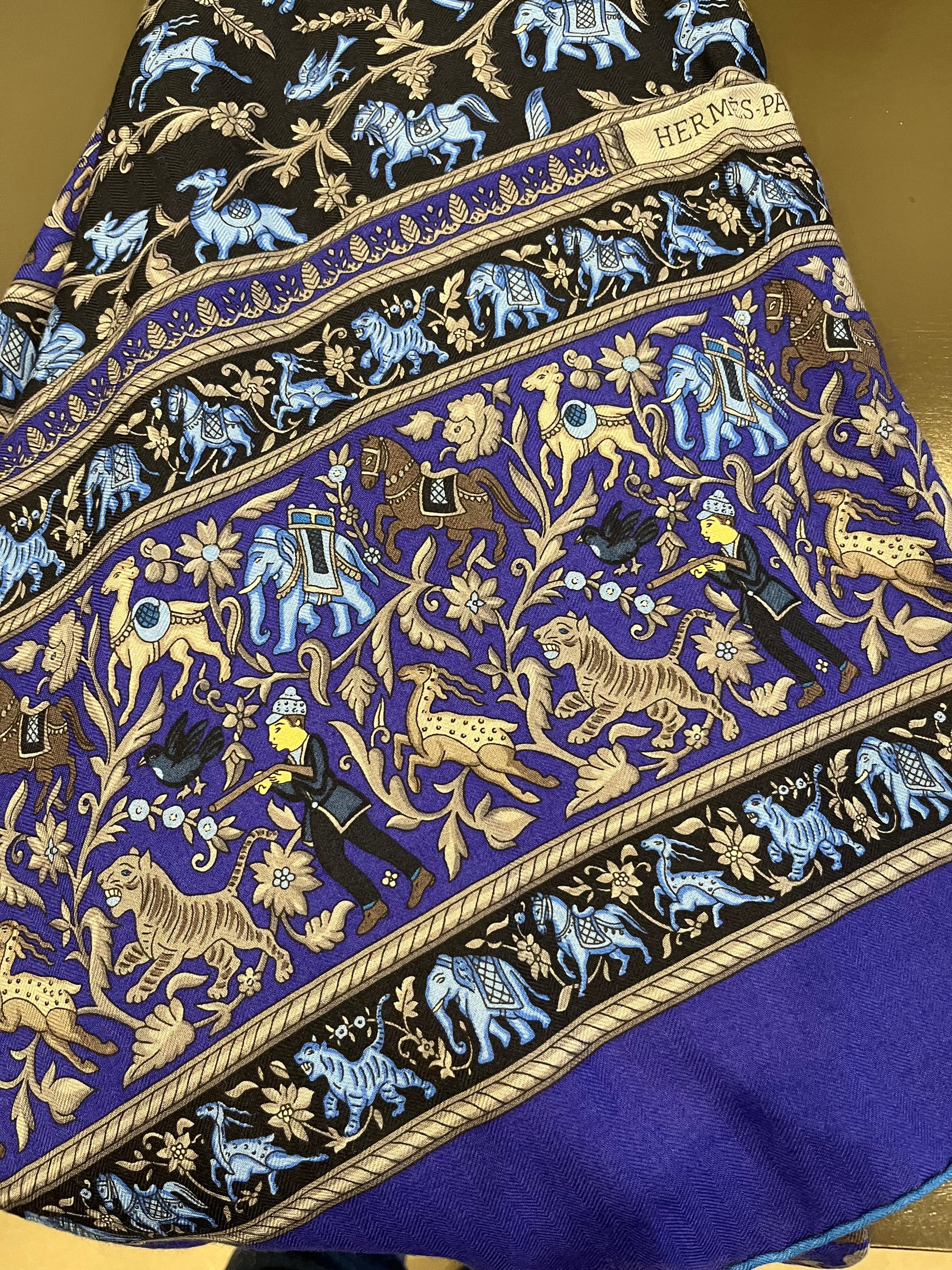 Hermès “Chasse en Inde” Cashmere & Silk Shawl (GM 140) – Violet / Black / Gold