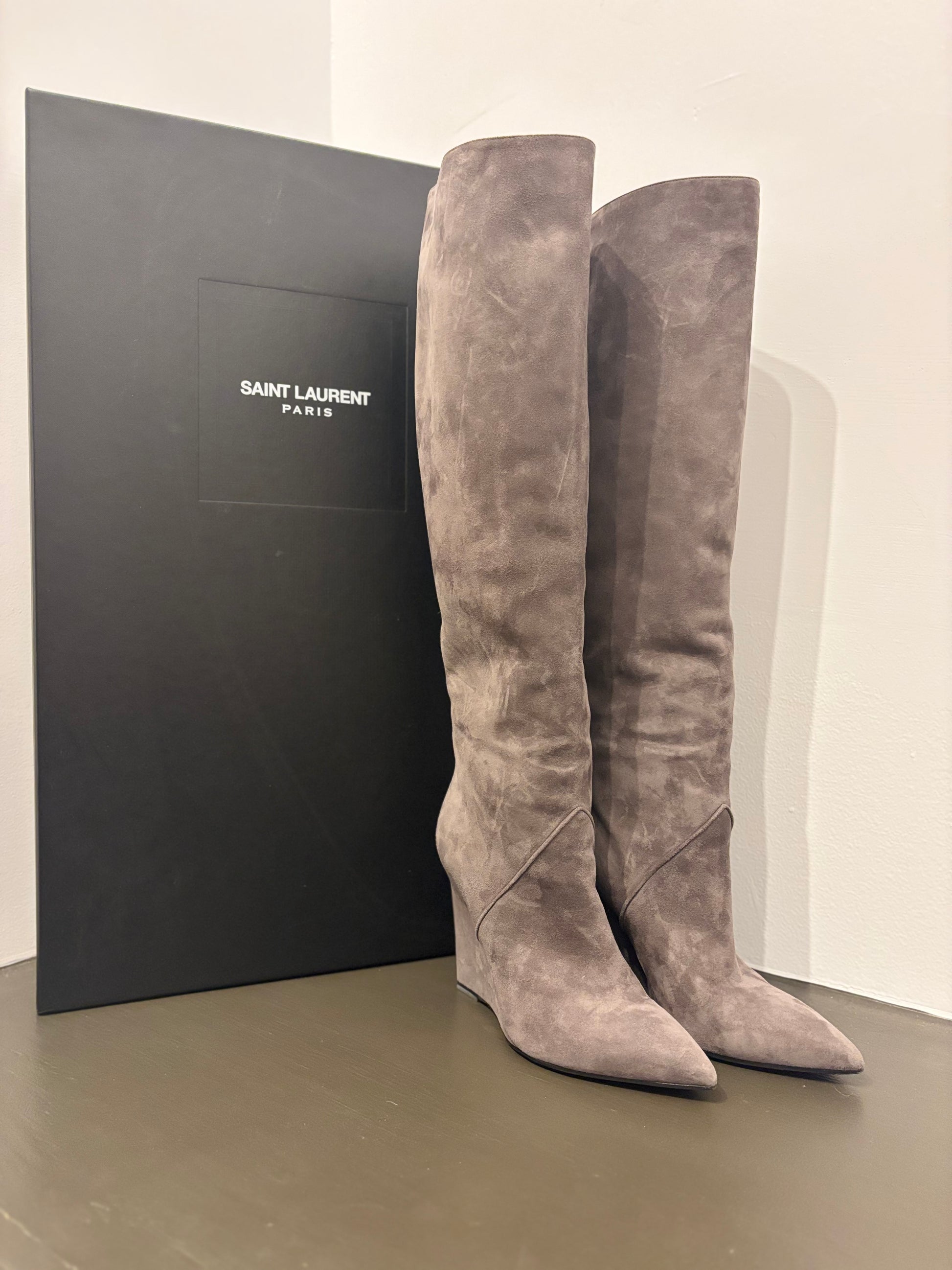 Elevated and effortlessly chic, these Saint Laurent tall wedge boots bring modern edge to a classic silhouette. Crafted from soft gray suede with a sleek pointed toe and sculpted wedge heel, they offer both height and comfort — perfect for pairing with dresses, denim, or winter layers.