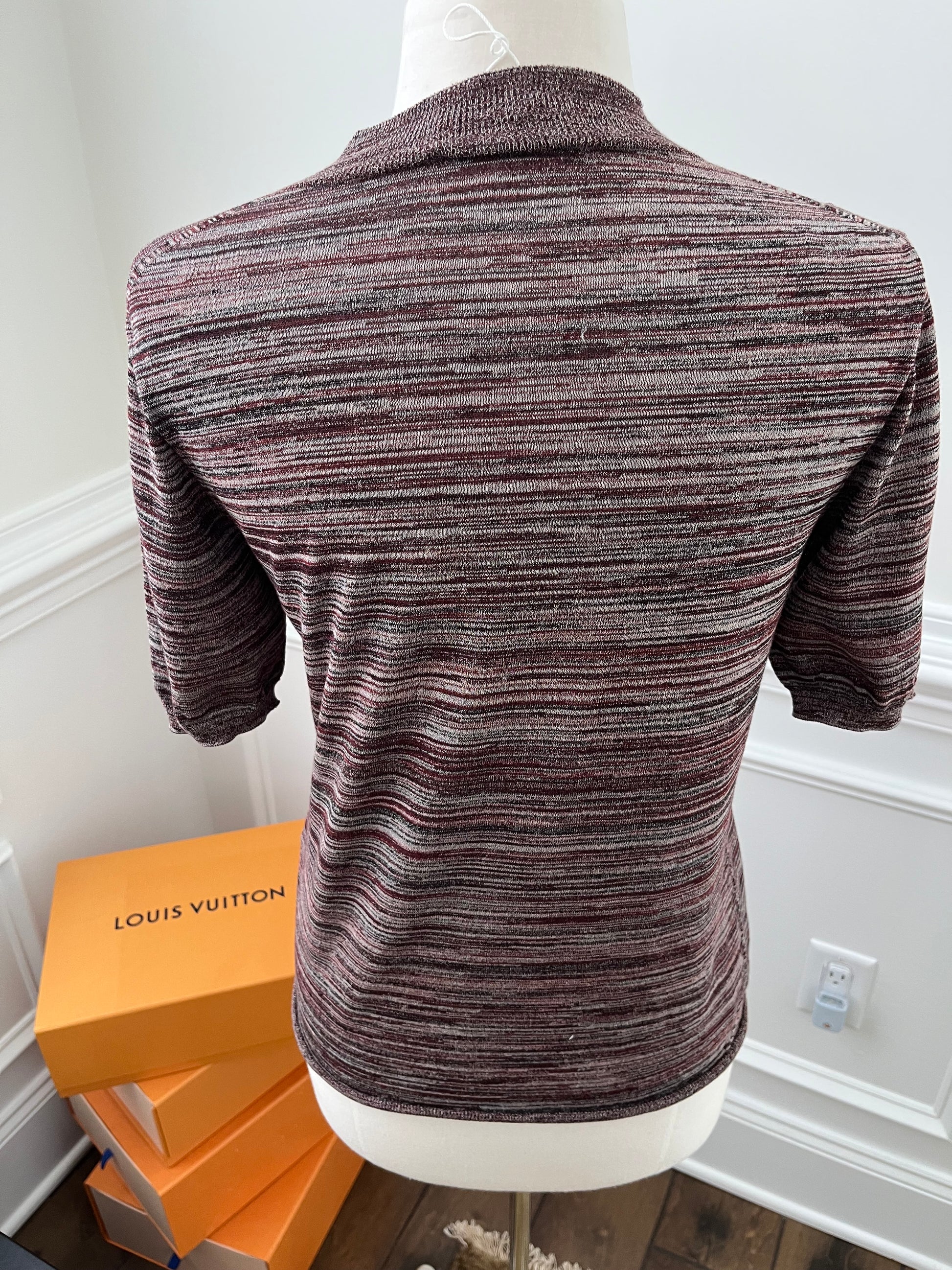 This Tory Burch short-sleeve sweater features a rich marled knit in shades of burgundy, charcoal, and taupe. With its mock neck and lightweight stretch fit, it’s the perfect elevated basic for transitional layering or polished casual looks. Size M