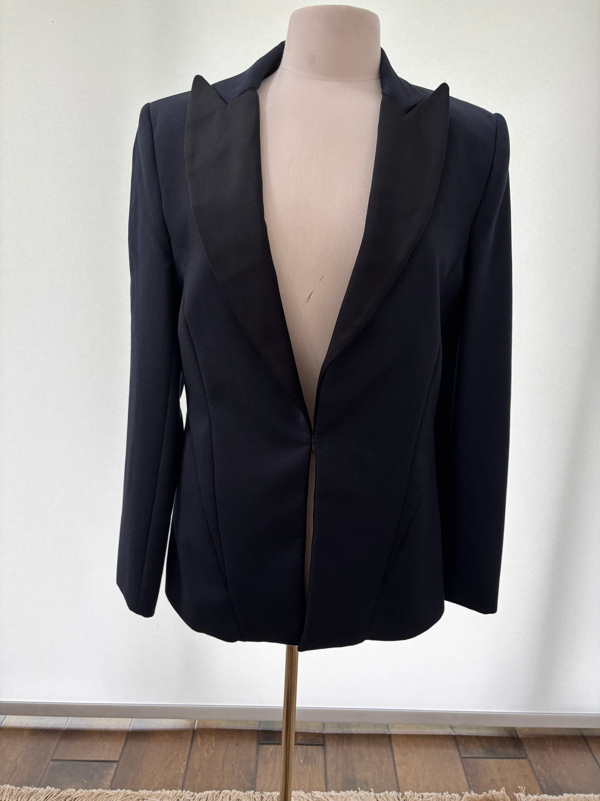 Sleek and sophisticated, this black tuxedo blazer features a satin shawl collar and tailored fit. Perfect for dressing up denim or completing an evening look.